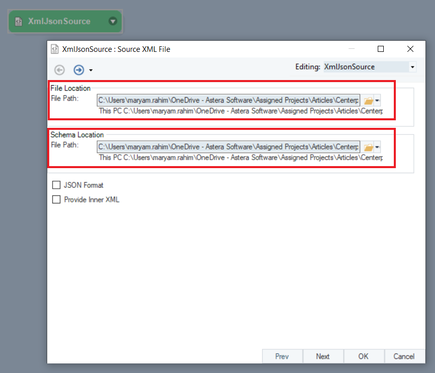 Drag-and-drop the XML/JSON File Source object onto the designer.