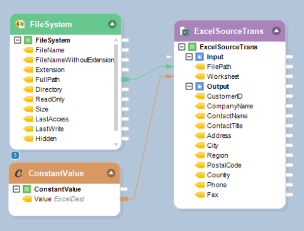 Map the FullPath field from FileSystem to the ExcelSource object’s Input node (FilePath).