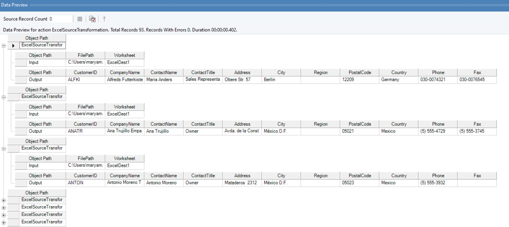 Now our Excel Source transformation object is ready. To preview the data, right-click on the ExcelSourceTrans object and select Preview Output.