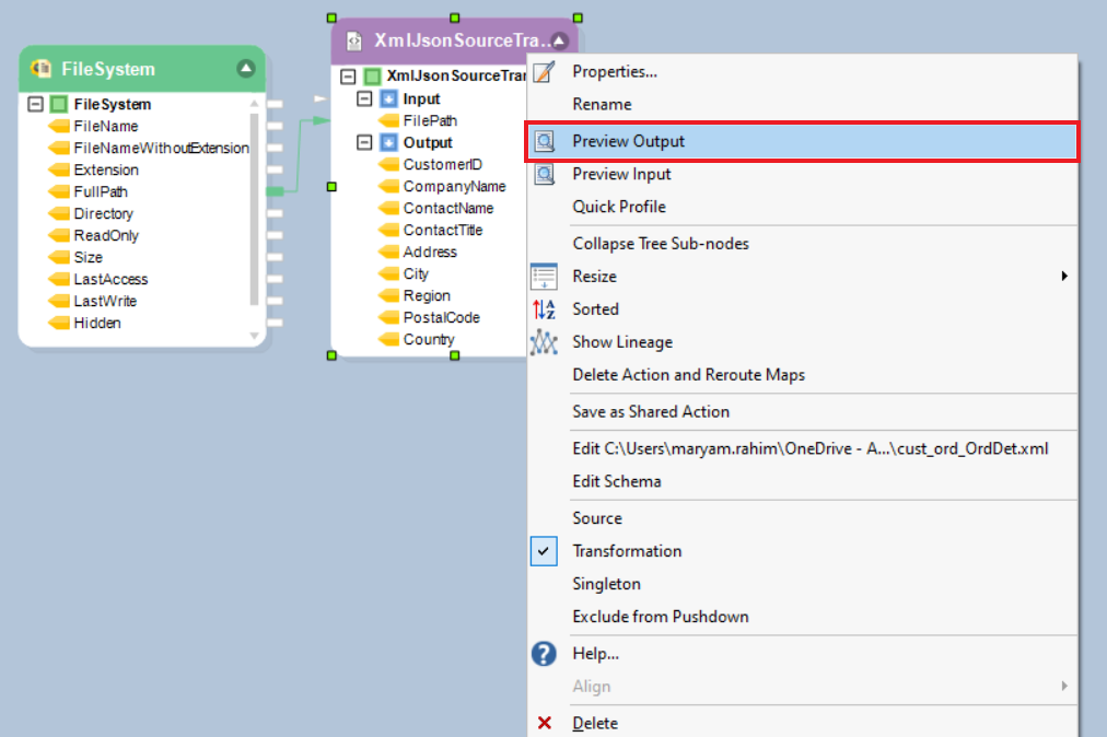 Now our XmlJson source transformation object is ready. To preview the data, right-click on the XmlJsonSourceTrans object and select Preview Output.