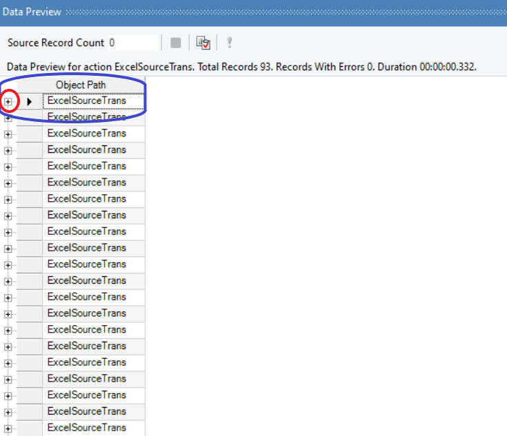 On selecting Preview output, you will be able to view the data in the Data Preview pane. The data that you see in the above image is in its condensed preview format. Click on the +icon right next to the root node ExcelSourceTran to expand the node and preview your data.