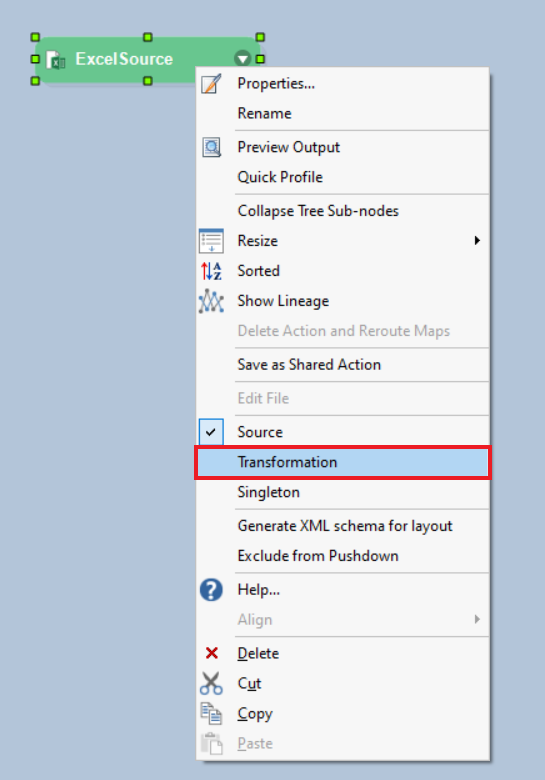 Once you have provided the File Path and configured the properties of the source object, click OK. Now, right-click on the header and select Transformation from the context menu, to change it to a Transformation object.