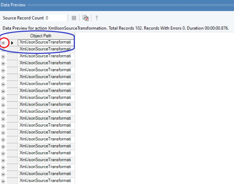 On selecting Preview output, you will be able to view the data in the Data Preview pane. The data that you see in the above image is in its condensed form. To expand the data and preview your output, you need to click on the +icon right next to the root node – XmlJsonSourceTran.