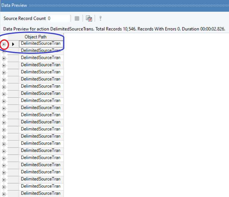 Once you select Preview output, you will be able to view the data in the Data Preview pane. The data that you see in the above image is in its condensed preview format. Click on the +icon right next to the root node of theDelimitedSourceTran object to expand the node and preview your data.