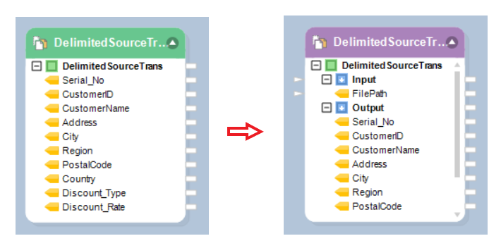 The header of the Delimited Source object will change to purple indicating that the source object is now converted into a Transformation object.