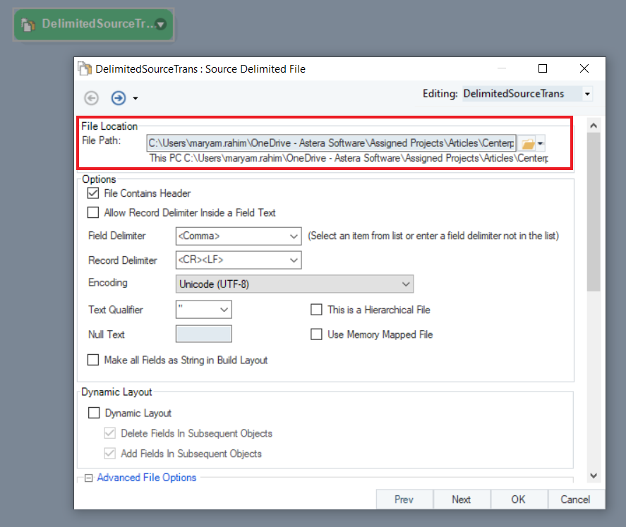 Go to the object’s properties and provide the File Path for the delimited source file.