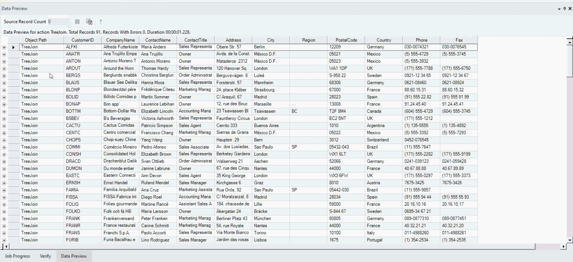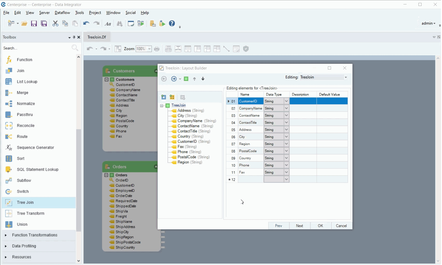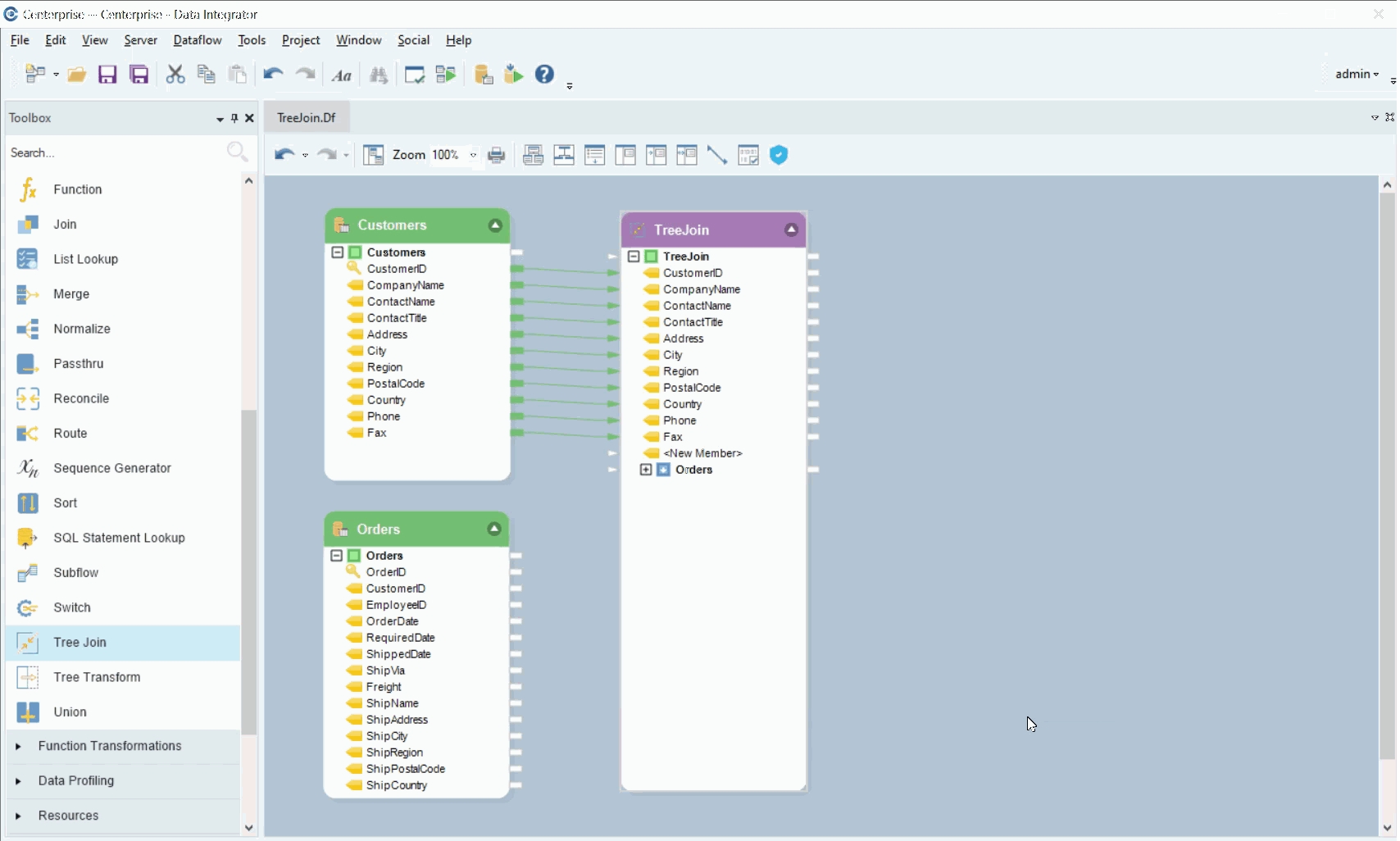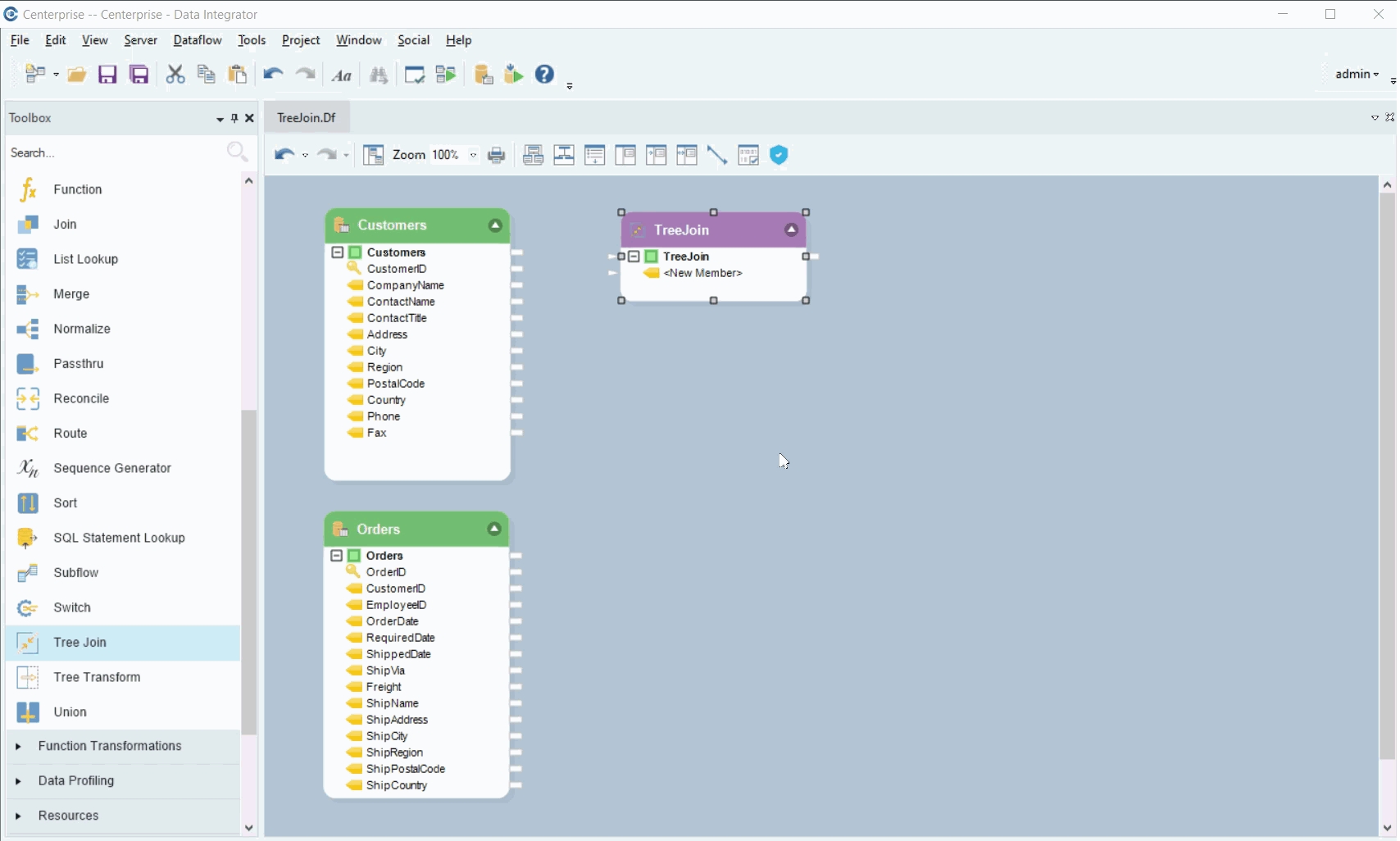 We will join these two datasets using the Tree Join Transformation object and create a hierarchical dataset in which all orders placed by a customer along with the order details are represented in a parent-child hierarchy.