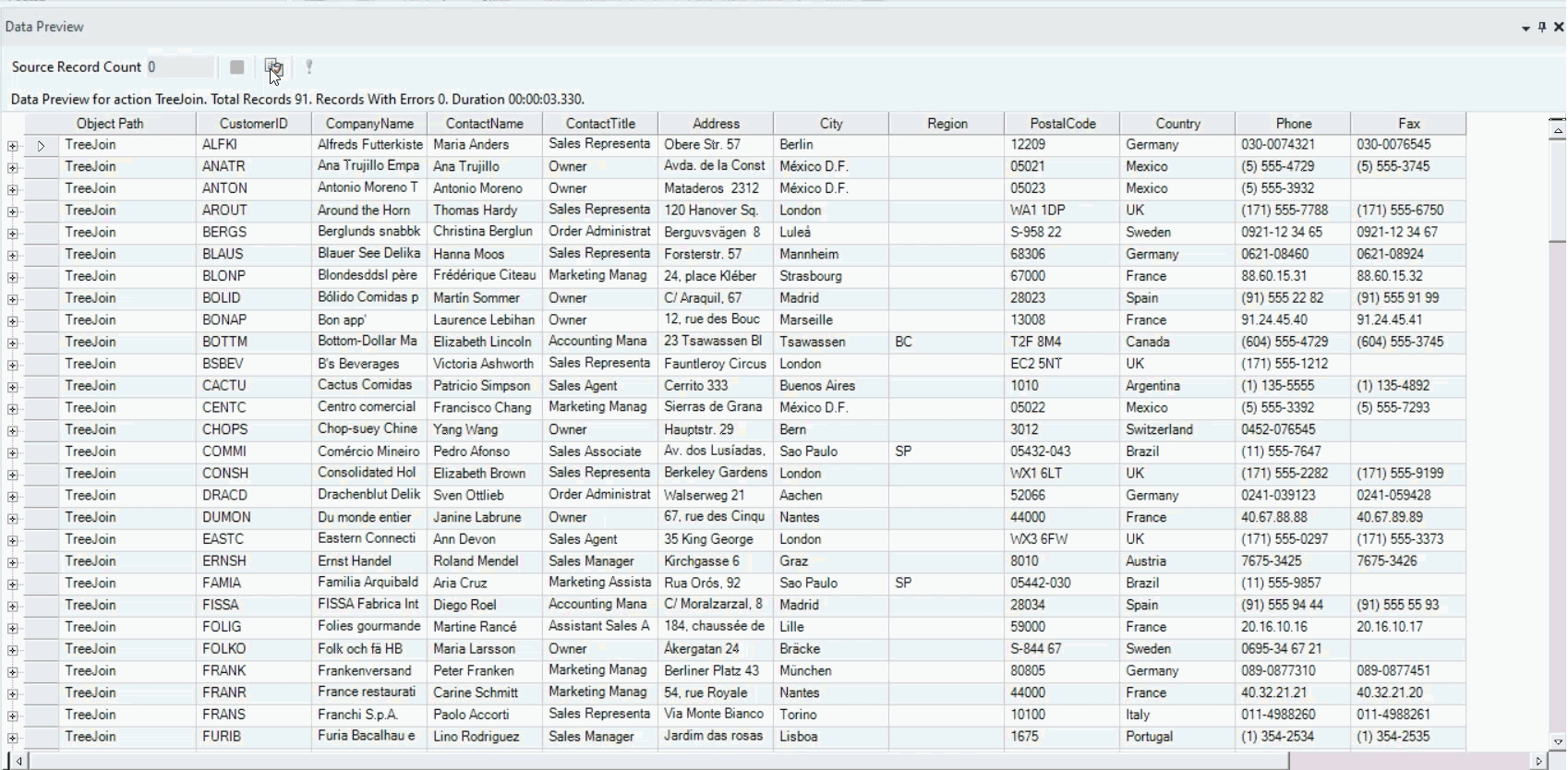 The TreeJoin object has returned the customer records in parent nodes. Upon expanding the node, you can see the order placed by the customer listed as its member unit under the parent node.