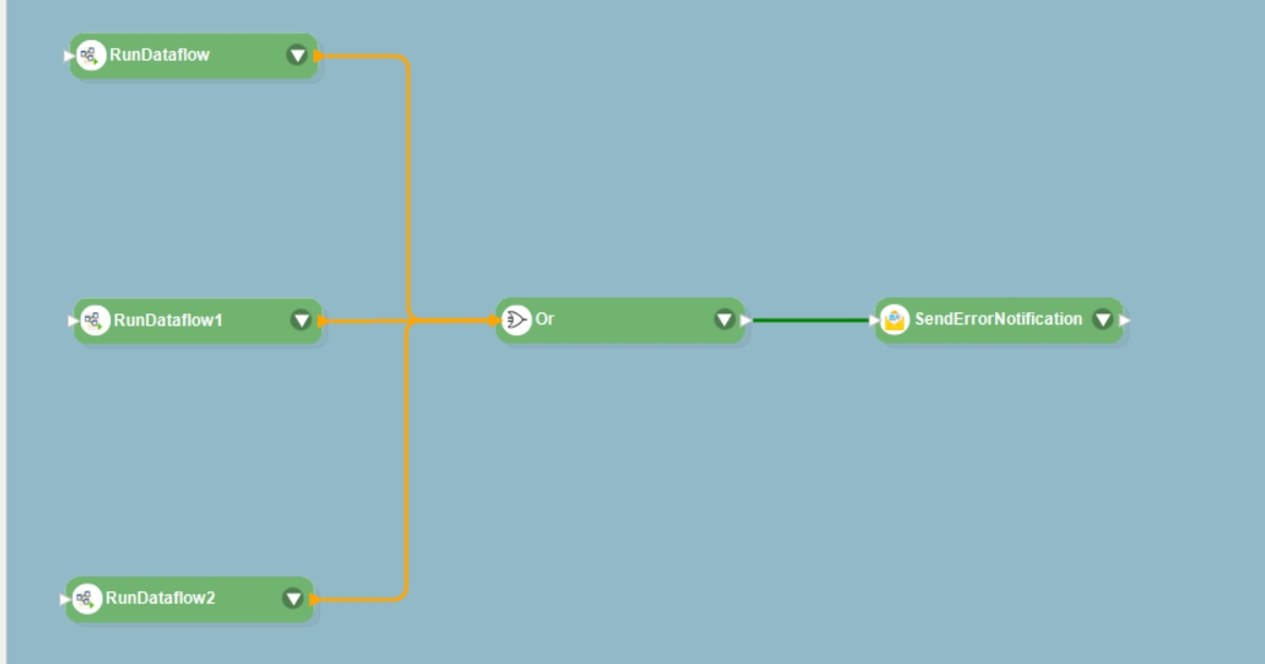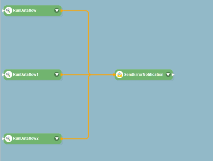In the following workflow, if all of the linked tasks, RunDataflow, RunDataflow1, and RunDataflow2, fail, the SendMail task will be triggered.