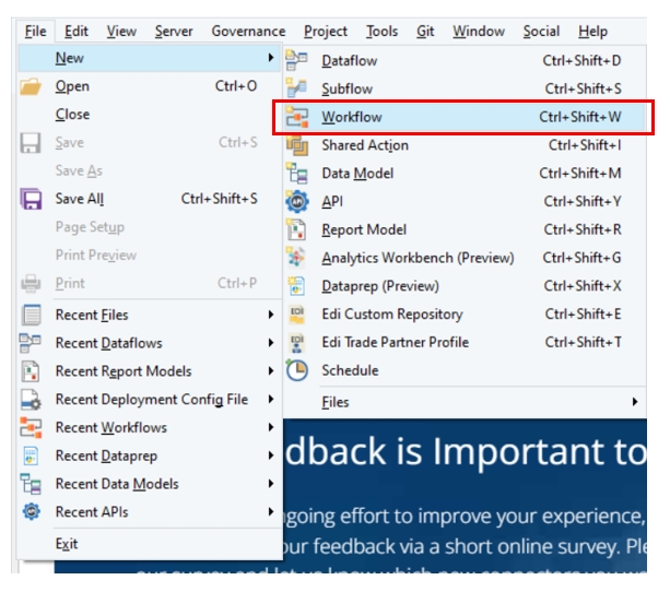 To create a workflow in Astera, go to the menu bar at the top and select File > New > Workflow.