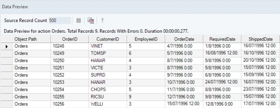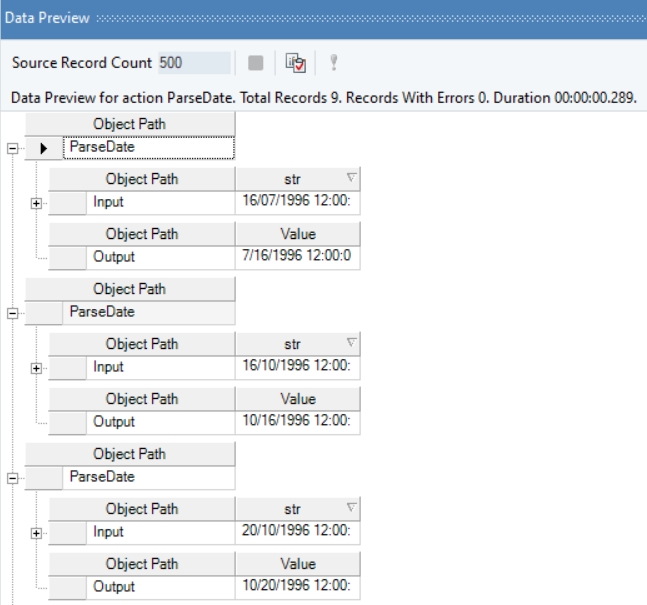In the output window, you can see values from the ShippedDate field have been successfully parsed by the function transformation object, as the provided date time format has been matched.