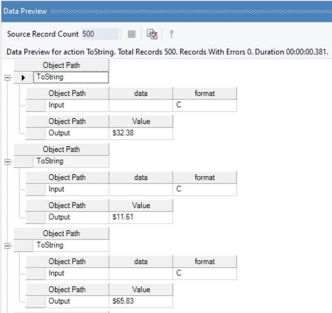 In this example we will attempt to convert the real values in this field to string values representing currency. We will map the Freight field to the data field of the function transformation object.