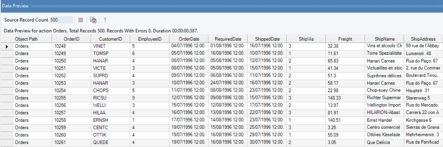 In the output window, you can see that the provided data from the Freight field has been converted to a string representing currency.