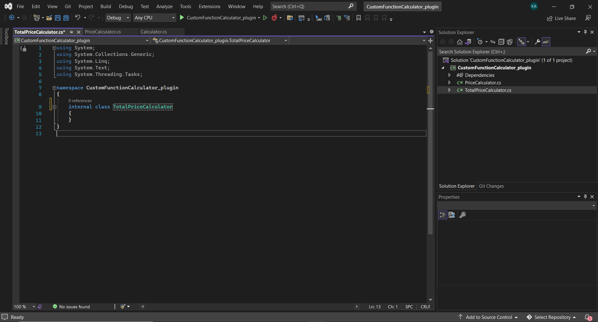 First, we will create a new .NET project in Visual Studio or any compiler which supports the .NET framework. We will name our project CustomFunctionCalculator_plugin.
