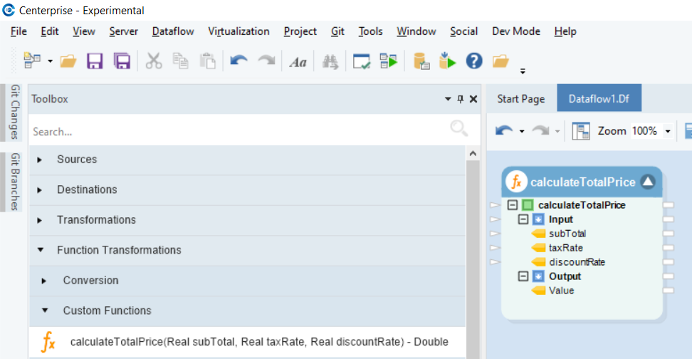 Now, if we open Astera's data integration tool, in the Function Transformations section of the Toolbox, a new Custom Function tab will appear. Upon expanding this tab, you can see that our custom function has been successfully created and deployed.