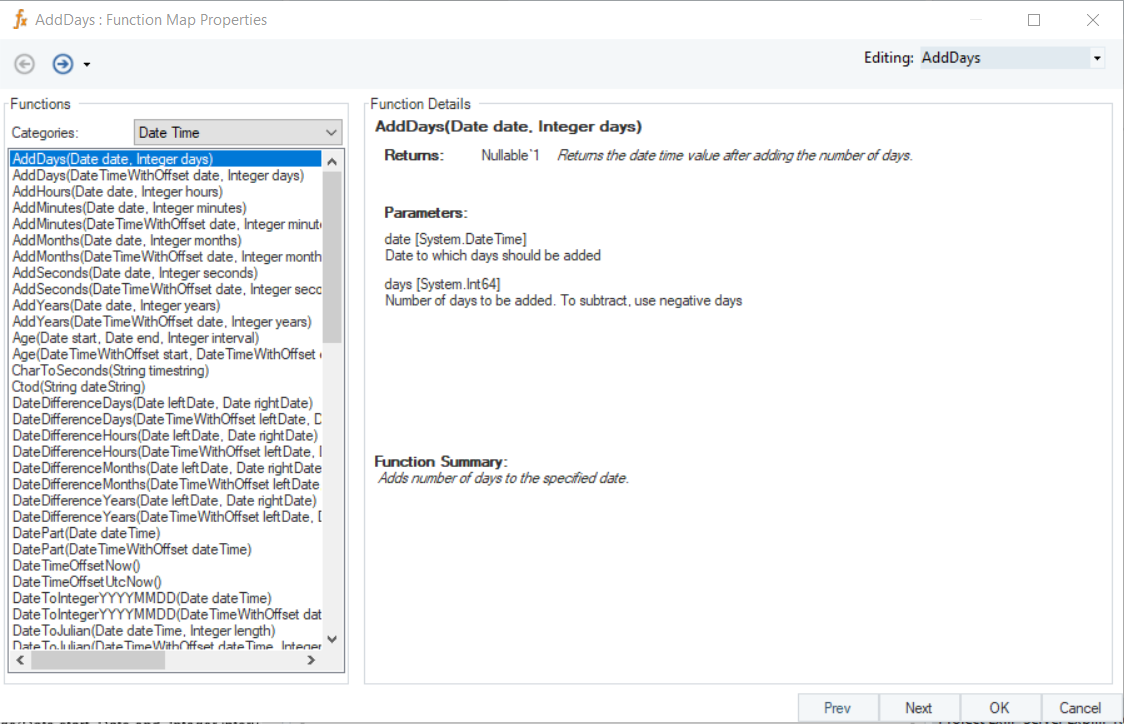 In this example, we will pass a date time value, and an integer value (indicating days to be added or subtracted) to the function transformation object using a Variables object.