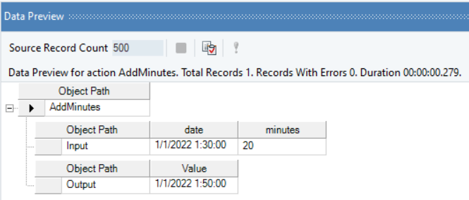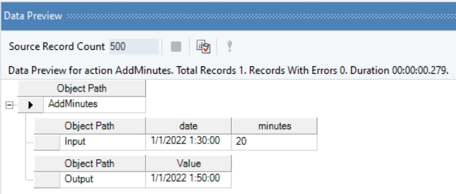 In the output window, you can see that the provided integer value, indicating minutes, has been added to the given date time value.