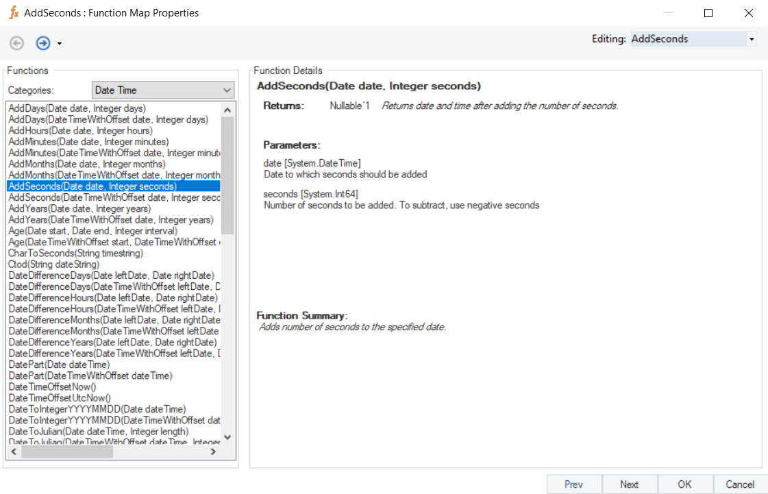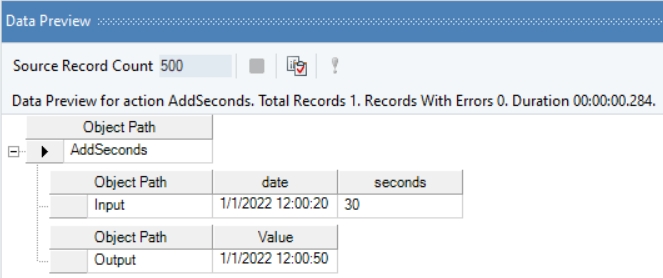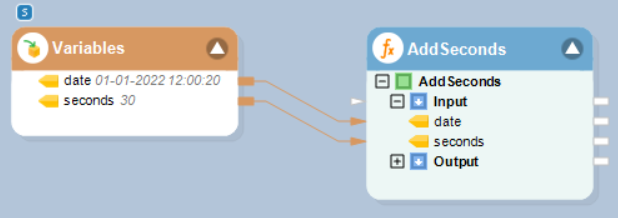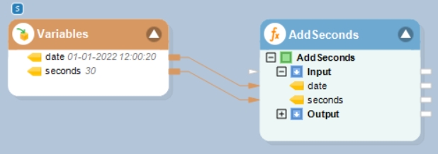 In this example, we will pass a date time value, and an integer value (indicating seconds to be added or subtracted) to the function transformation object using a Variables object.