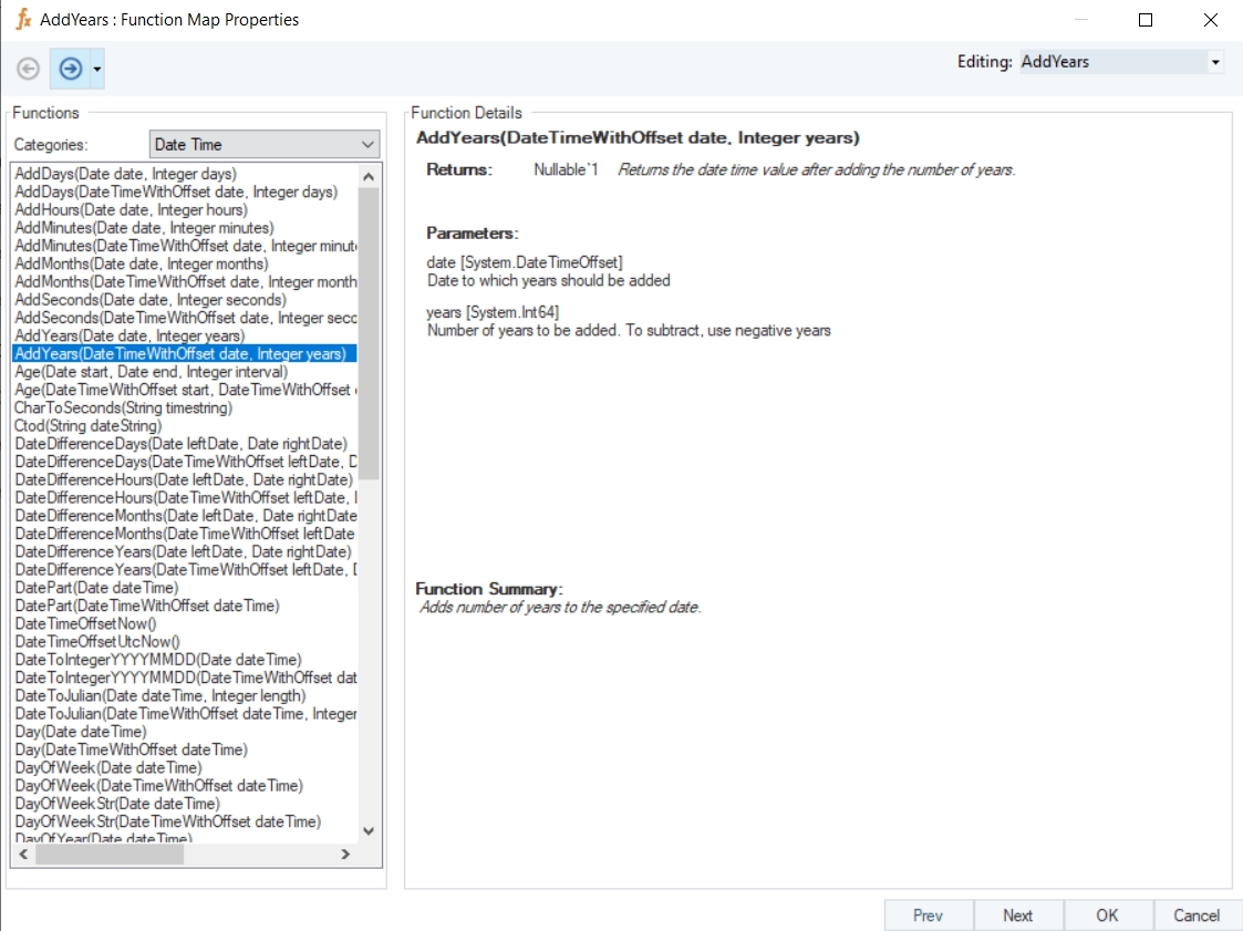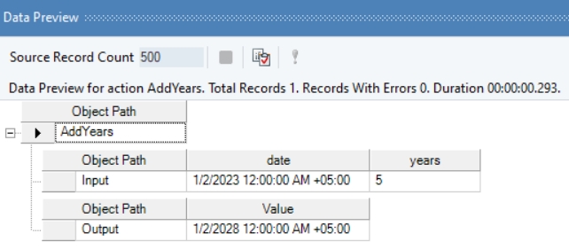 In this example, we will pass a date time offset value, and an integer value (indicating years to be added or subtracted) to the function transformation object using a Variables object.