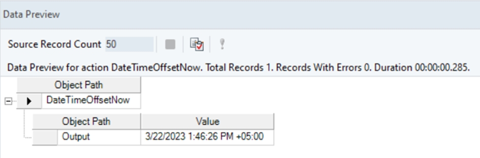 Right-click on the function transformation object and select Preview Output. You can see that Astera Data Stack has returned the current system date time with offset value.
