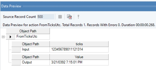 In the output window you can see that the specified ticks value has been converted into a UTC date time value.