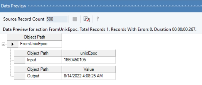 In the output window you can see that the specified Unix epoch value has been converted into a date time value.