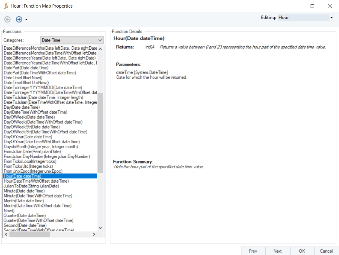 Returns a value between 0 and 23 representing the hour part of the specified date time value.