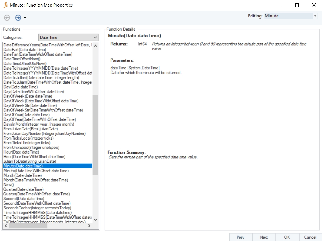 Returns a value between 0 and 59 representing the minute part of the specified date time value.