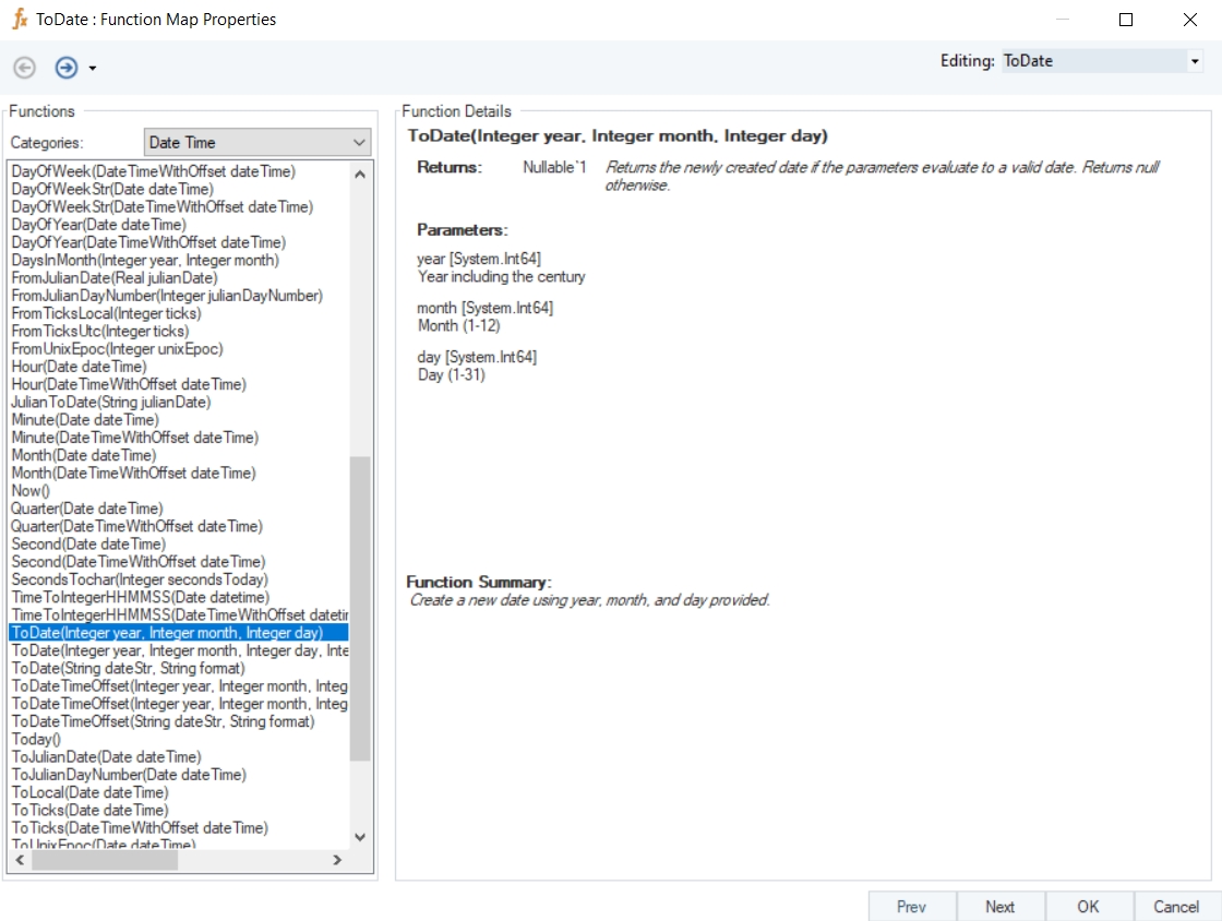 Returns the newly created date if the parameters evaluate to a valid date. Otherwise returns null.