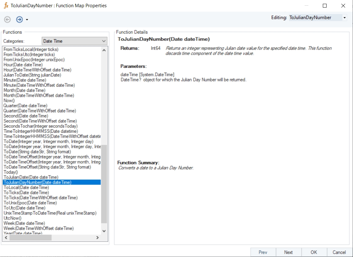 Returns an integer representing Julian day number for the specified date time. This function discards the time component of the date time value.