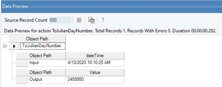 In the output window, you can see that the provided value has been converted into a Julian day number.