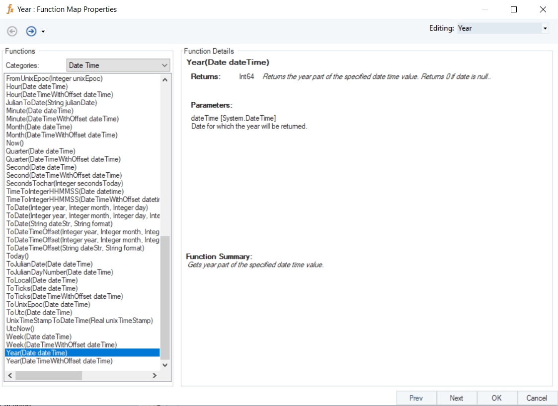 Returns the year part of the specified date time value. Returns 0 if date is null.