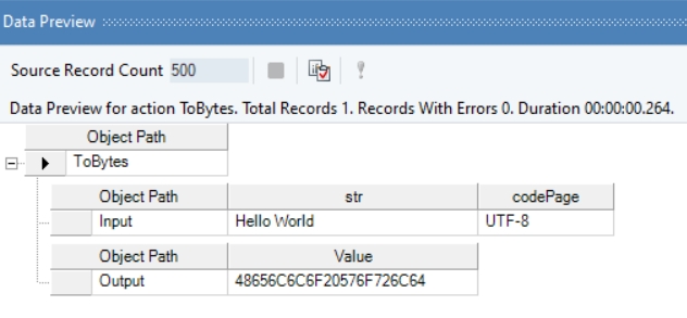 Right-click on the function transformation object and select Preview Output. You can see that Astera has returned the byte value of the specified UTF-8 string.