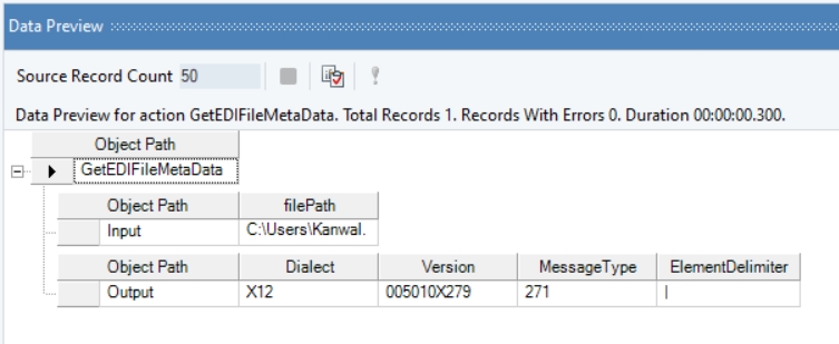 Right-click on the function transformation object and select Preview Output. As you can see, Astera Data Stack has returned the specified EDI file’s meta-data.