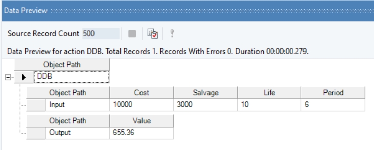 Right-click on the function transformation object and select Preview Output. You can see that Astera Data Stack has returned depreciation value using the double-declining method.