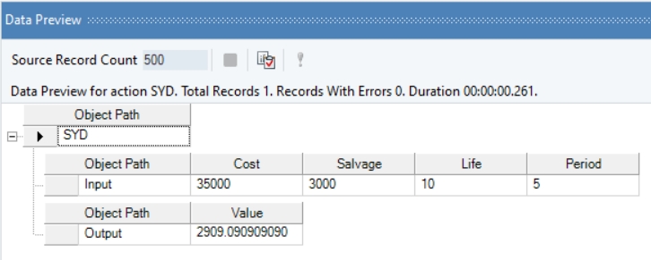 Right-click on the function transformation object and select Preview Output. You can see that Astera Data Stack has applied the SYD function, and returned the sum-of-years depreciation value.