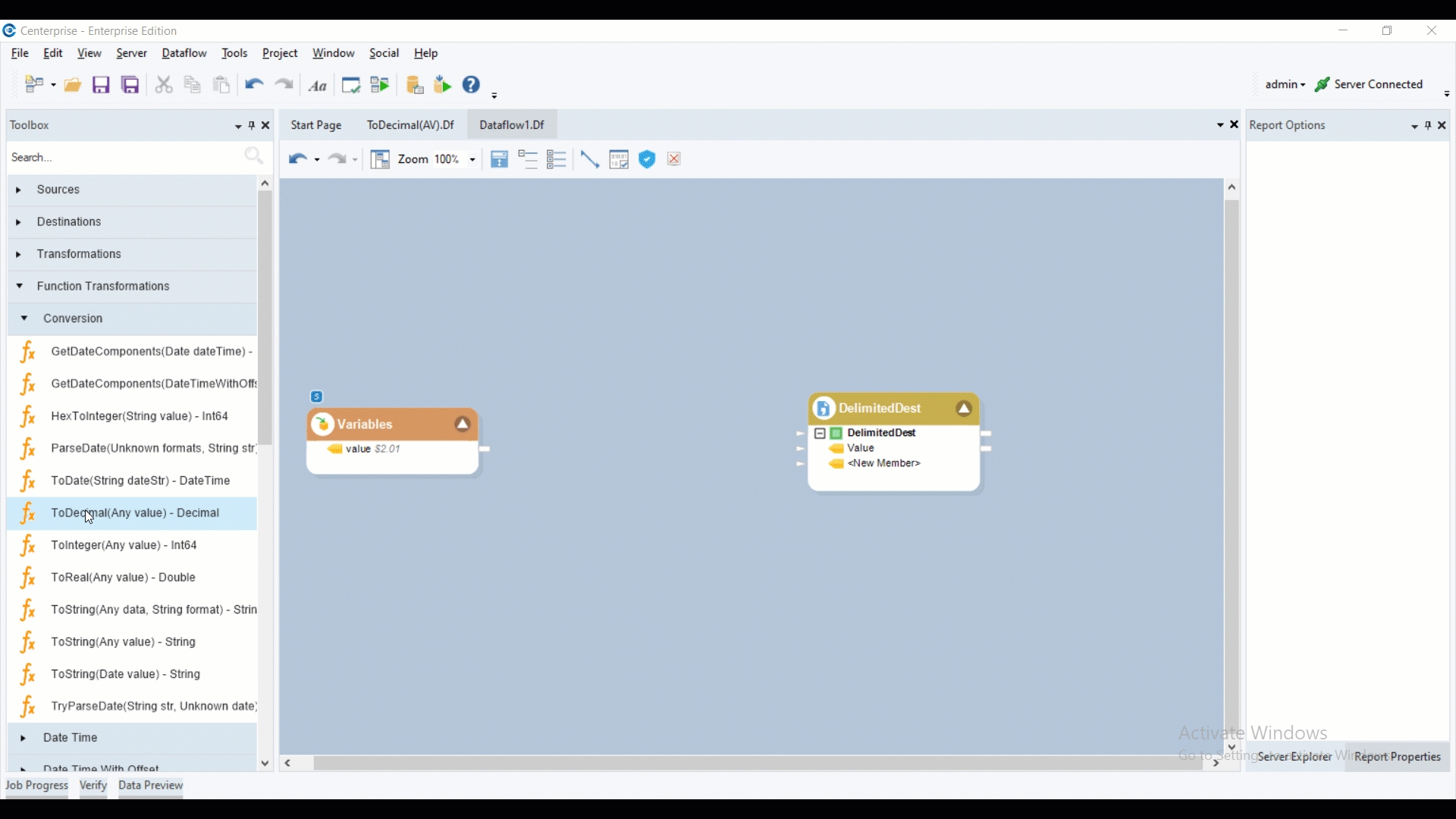To use any Function Transformation object in a dataflow, simply drag-and-drop from the Toolbox onto the designer, and map fields from and to the object, as required.