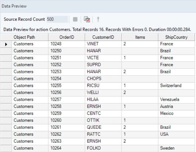 We have a Customers dataset, with missing values in the Items and ShipCountry fields, which we will use for this function.