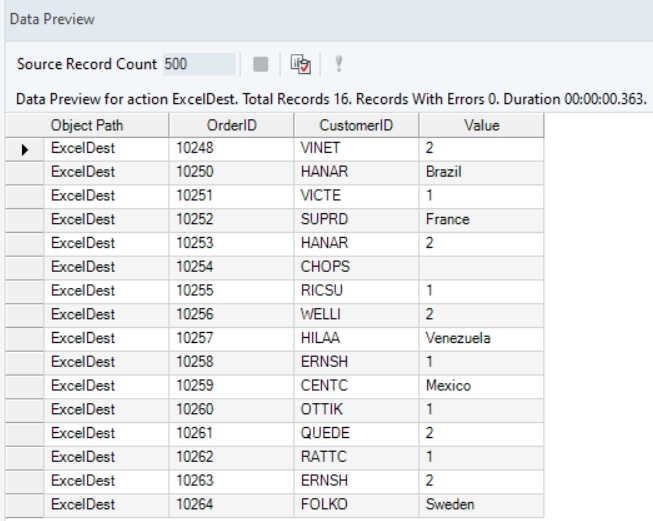 Right-click on the Excel Workbook Destination object and select Preview Output. You can see that Astera Data Stack has created a new column, and returned a value from either Items (value1), ShipCountry (value2), or null (if both specified parameters are null), in this particular order.