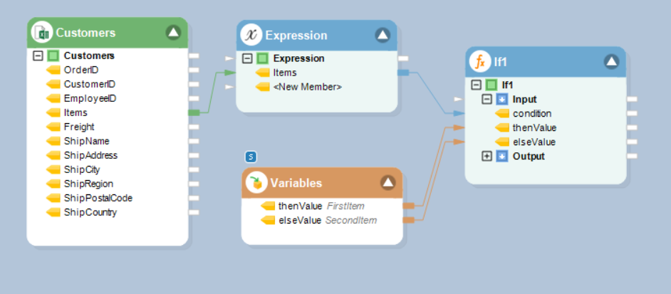 In this example we will use the Expression object to define the condition, and a Variables object to define a string thenValue and a string elseValue.