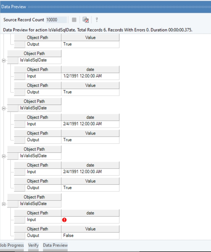 In the output window, you can see that the Boolean value, True, has been returned for values that are present in the valid SQL server DateTime range, and the value, False, has been returned otherwise.