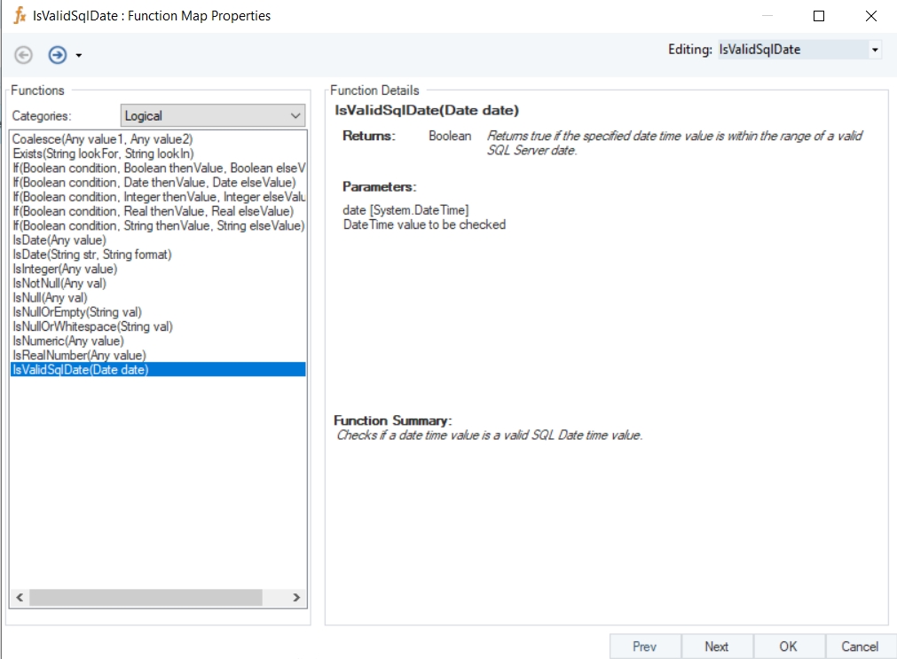 Returns true if the specified date time value is within the range of a valid SQL Server date. Otherwise returns false.