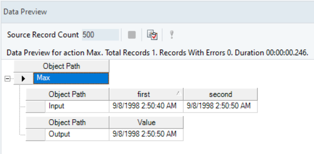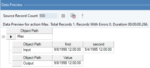 In the output window, you can see that the later datetime of the two provided datetime values has been returned.