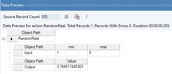 In the Data Preview window, you can see that a random real value, which falls within the provided min and max values, has been generated.