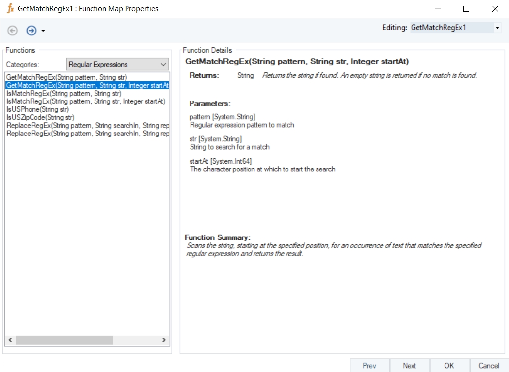 GetMatchRegEx (String pattern, String str, Integer startAt)