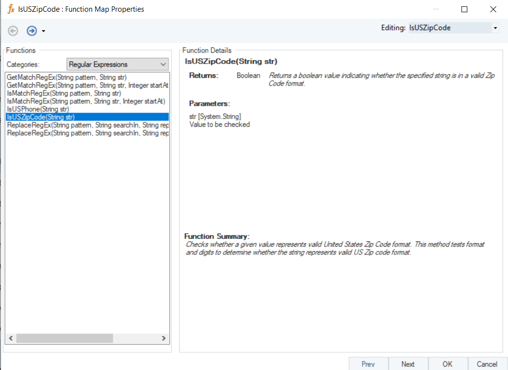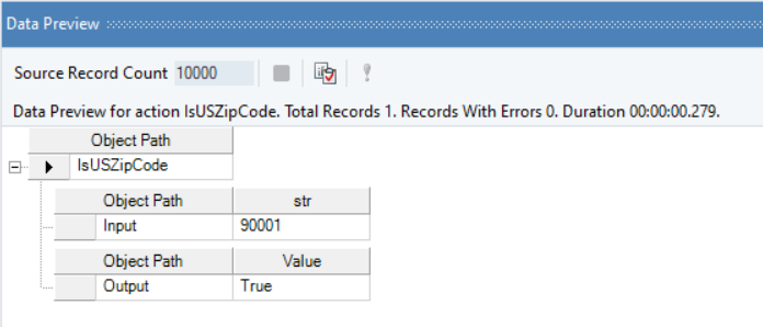In the output window, you can see that Astera has returned “True”, as the specified string matches a valid US Zip Code format.