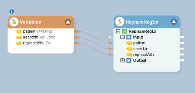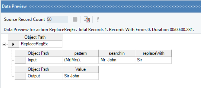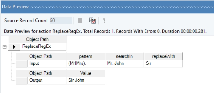 In the output window, you can see that Astera has returned a string value with the appended replaceWith value, as the specified pattern value was matched with the searchIn value.