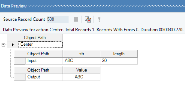 Right-click on the function transformation object and select Preview Output. You can see that Astera Data Stack has returned the specified string centered in accordance with the provided length value.