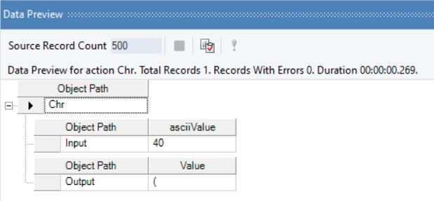Right-click on the function transformation object and select Preview Output. You can see that Astera Data Stack has returned a string value converted from a specified ASCII value.
