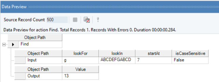 Right-click on the function transformation object and select Preview Output. You can see that Astera Data Stack has returned the integer value “13”, indicating that the lookFor value’s positional integer value in the lookIn string is “13”. Note that since the specified starting position is “7”, the intital lookFor value, “g”, in position “6”, has been ignored.